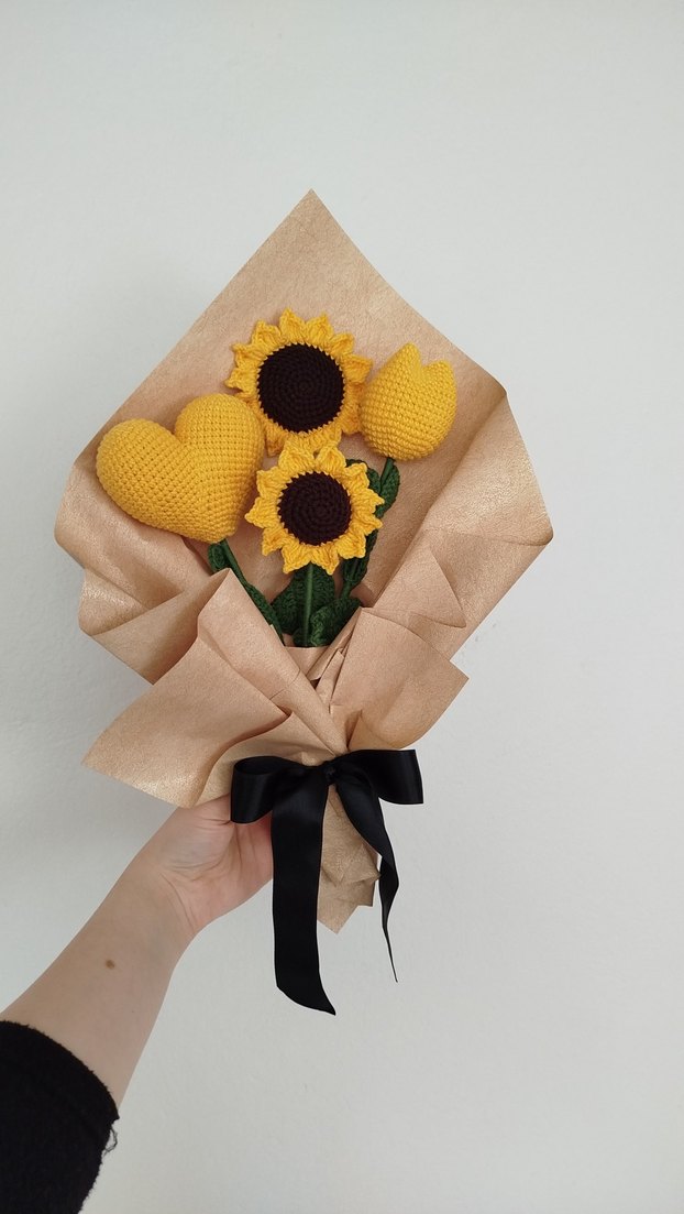 El örgüsü bohem tarzda ayçiçeği, lale ve kalp figürlü çiçek buketi istediğiniz çiçek modelleri eklenebilir