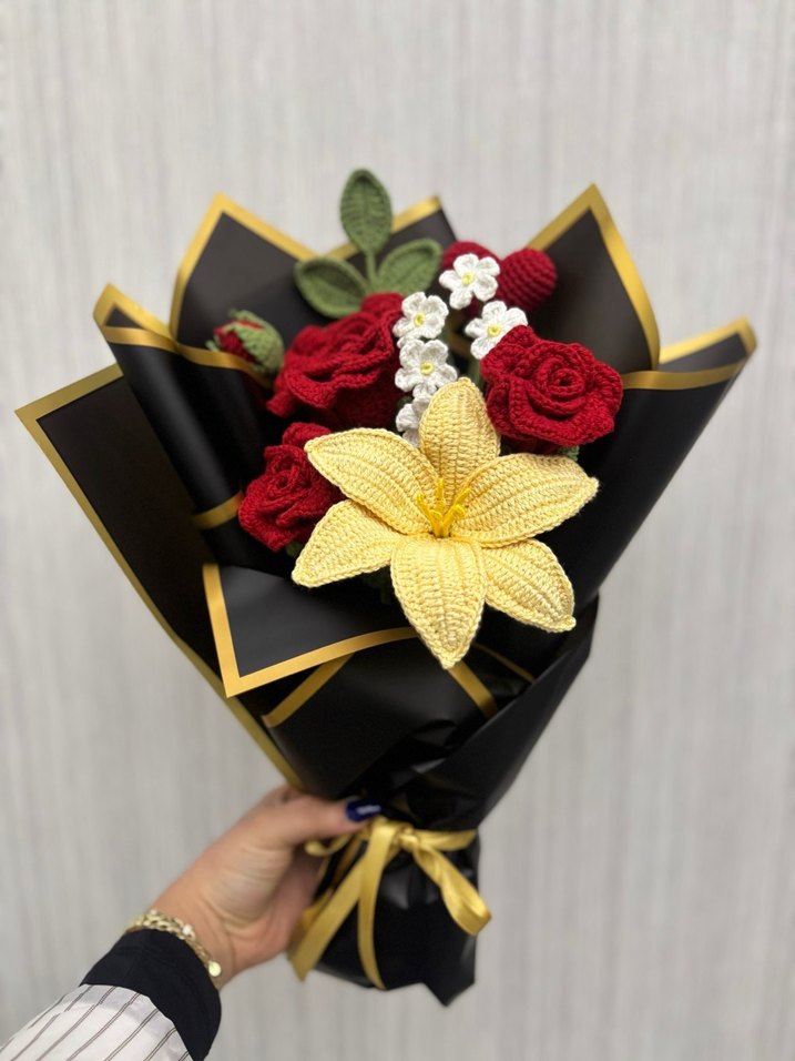 El örgüsü kırmızı güller ve büyük sarı çiçekten oluşan bohem tarzda çiçek buketi, siyah ve altın renkli kağıtla sarılmıştır.