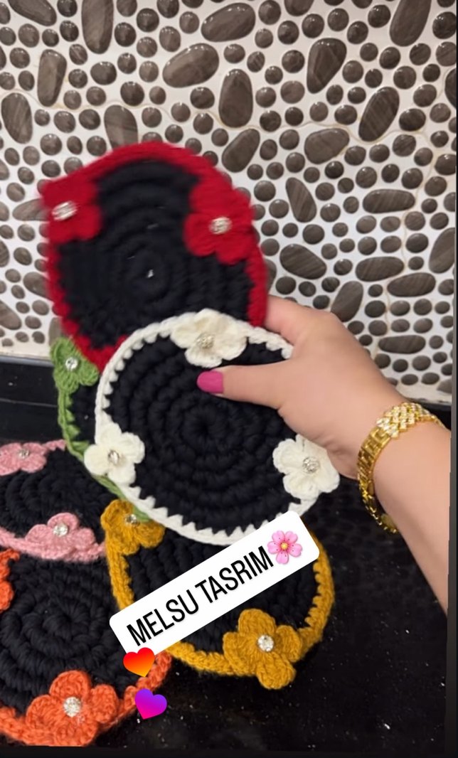 MELSU TASRIM imzalı, renkli çiçek detaylı el örgüsü bohem tarzda bardak altlıkları. Masanıza sıcaklık katmak için ideal. Sunumluk