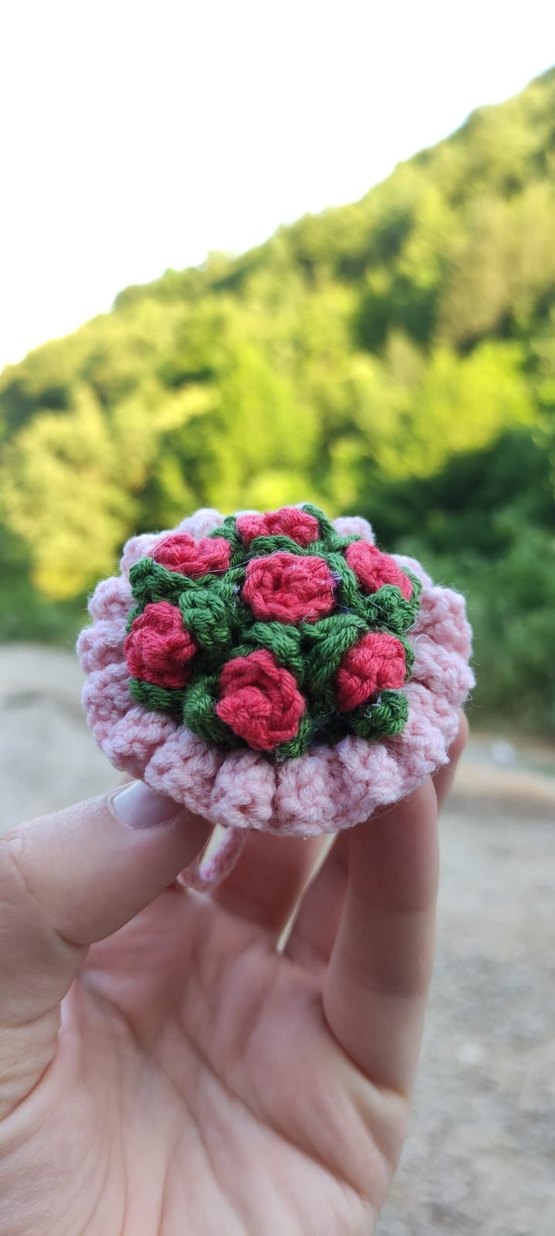 Bohem tarzda, el örgüsü pembe ve kırmızı çiçekler ile yeşil yaprakların bulunduğu doğal görünümlü Magnet. 3-5 gün içerisinde kargoya verilir. Sipariş üzerine üretilmektedir.