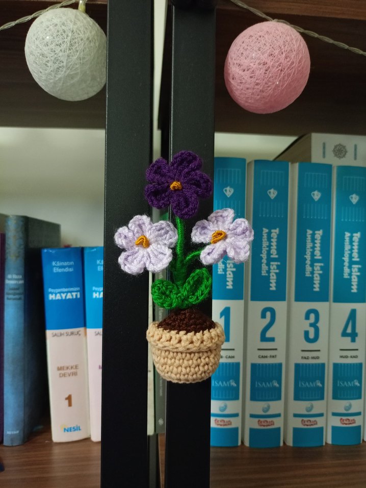 El örgüsü bohem tarzda, mor ve açık mor çiçeklerin bulunduğu küçük saksı çiçeği. Unutma beni magnet saksı çiçeği