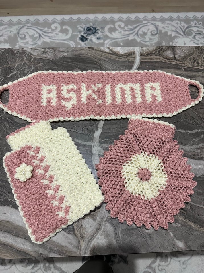 El yapımı bohem örgü set, üzerinde 'Aşkıma' yazan pembe-krem parça, çiçekli dikdörtgen parça ve yuvarlak motiften oluşur.