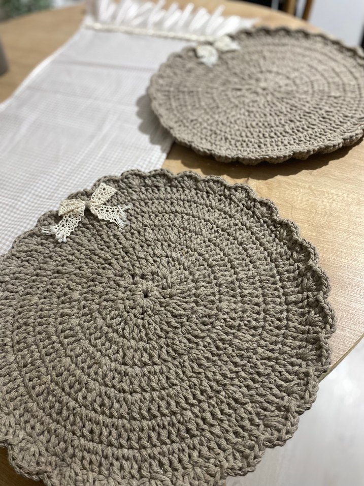 Kalın örgü ipten yapılmış, dantel fiyonk detaylı bohem tarzı yuvarlak el örgüsü amerikan servisler. Masanıza rustik bir hava katar. Sadece 4 adet vardır . 4 adet alımda 550 TL 2 adet alımda 300 TL 1 adet alımda 150 TL