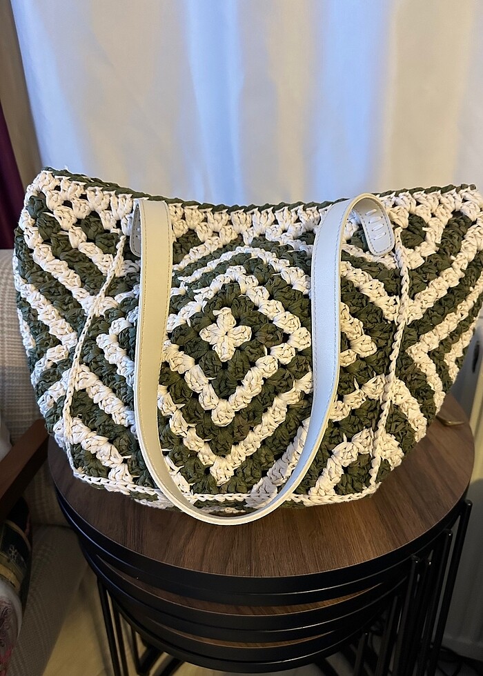 Günlük ya da plaj çantası olarak kullanılabilir. Sipariş usulü talep halinde farklı renklerde de yapılabilir. Kağıt rafya ile yapılmıştır.