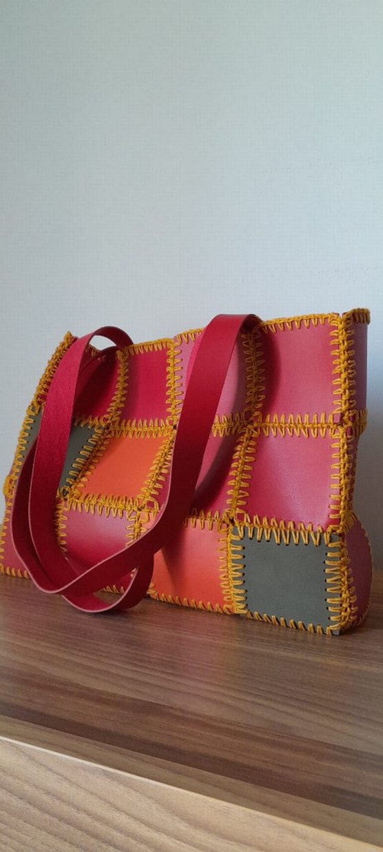 Canlı dikiş detayları ve fermuarlı kapanışı olan renkli deri patchwork tasarımlı bohem kadın çantasıdır.