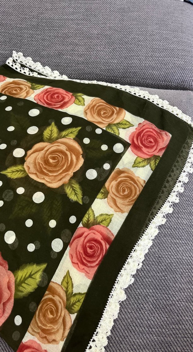 Kadınlar için vintage tarzda, çok renkli çiçek ve puantiye desenli fular. Dantel detaylı fırfır kenarlarıyla bohem bir görünüm sunar.