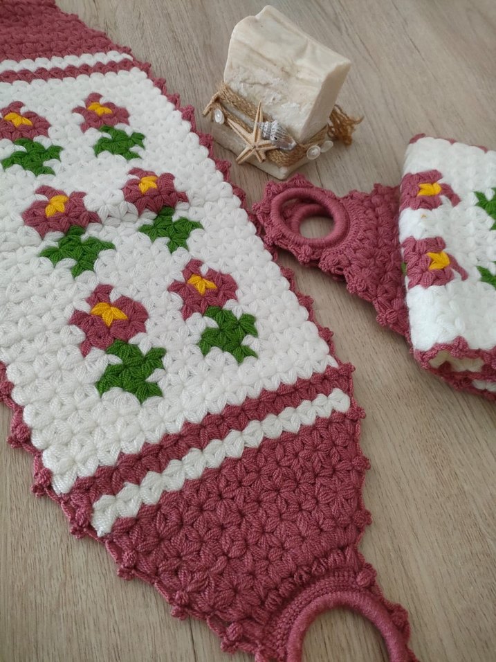 Beyaz ve toz pembe renklerde, çiçek desenli el örgüsü banyo lifleri. Asmak için halka detaylı ve yumuşak dokulu. ( 2 adet )
