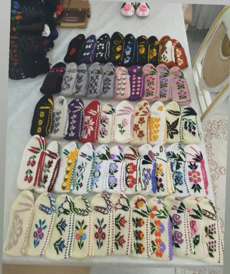 Yumuşak iplikle el örgüsü yapılmış, çeşitli renkli çiçek desenlerine sahip patikler.