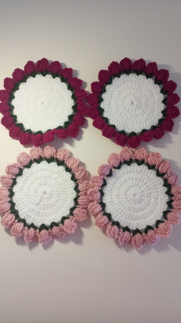 El yapımı, pembe ve bordo renklerde çiçek desenli yuvarlak bardak altlığı, dokulu kenarları ve yumuşak pamuk hissiyle sunumlariniza şıklık katacak hemen teslim hepsinin fiyati