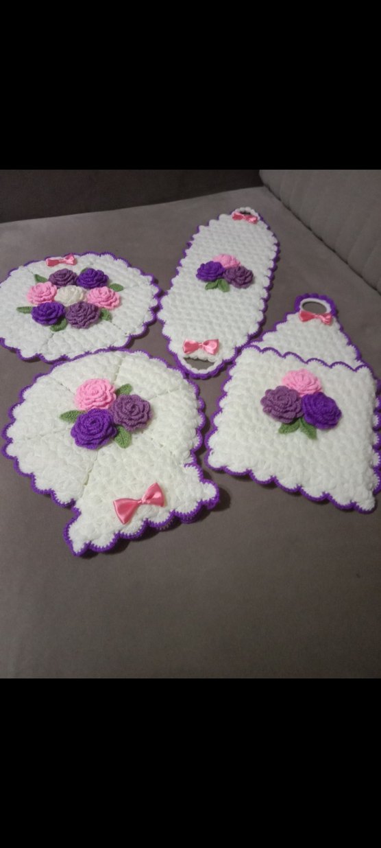 El örgüsü beyaz dekoratif set, mor ve pembe çiçekler ile yeşil yapraklar süslenmiş, mor kenarlıklı ve küçük pembe fiyonk detaylıdır.