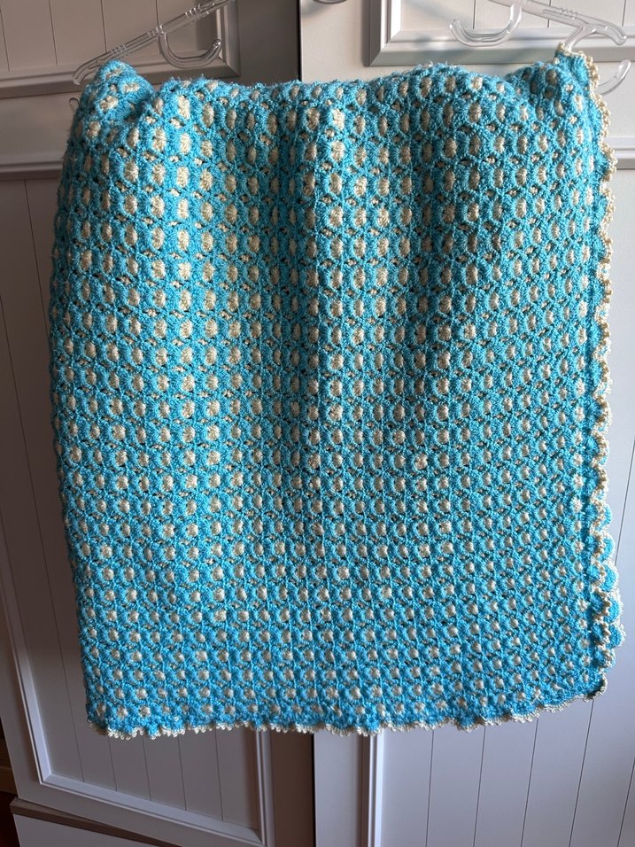 El örgüsü kalın bir battaniye. Temizdir deformesi yok. Ebat 100x100 cm turkuaz sarı renklerde
