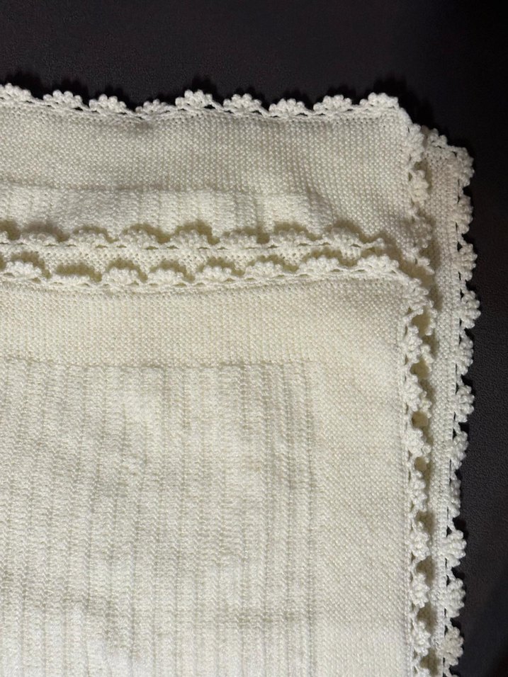 Yumuşak el örgü beyaz çocuk battaniyesi, narin tığ işi kenarlarla çocuklara sıcaklık ve konfor sağlar. İstediğiniz ölçülerle istediğiniz renkte sipariş alınır.