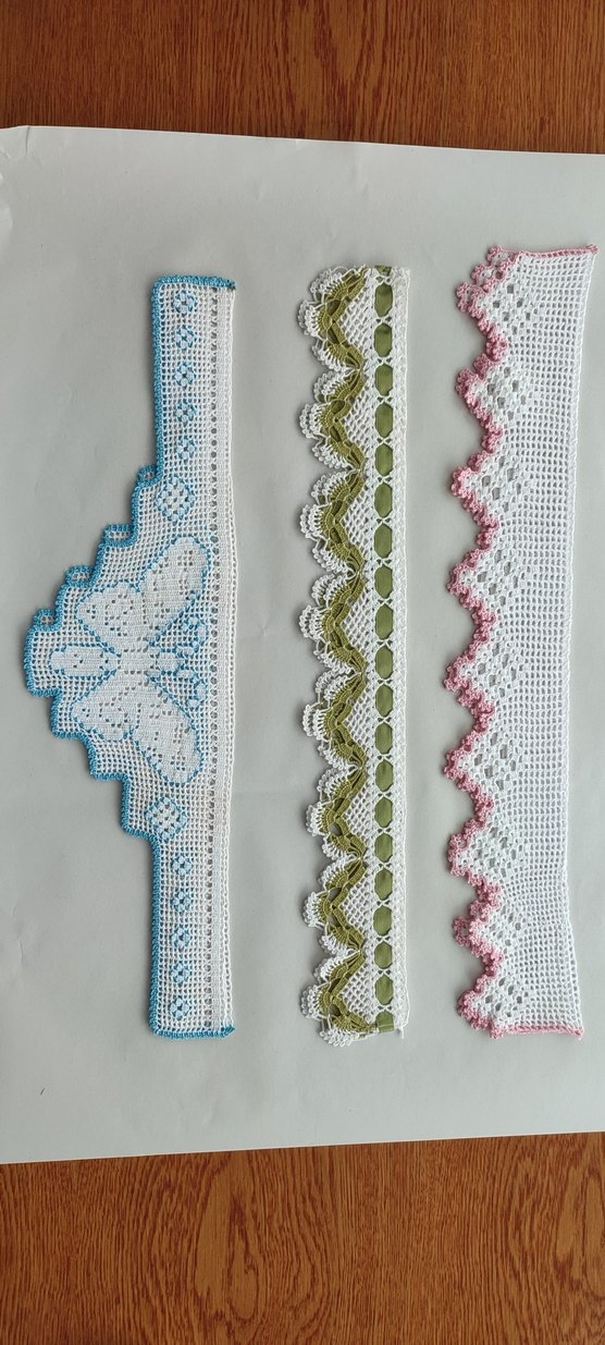 Üç farklı renkli kenarlığı olan el örgüsü dantel seti, dekoratif kullanım için uygundur. Adet fiyatıdır.