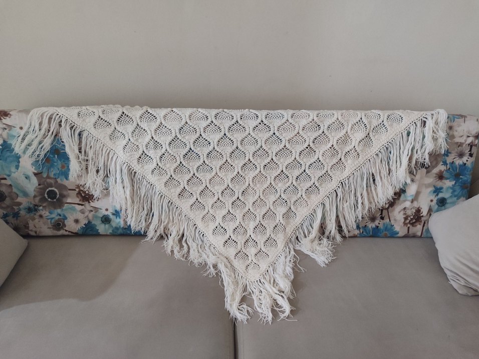 Dantel detaylı ve püsküllü beyaz örme kadın şalı, bohem tarzını yansıtır. Yumuşak dokulu, rahat ve retro bir görünüm sunar.