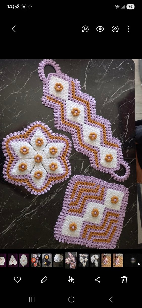 Pastel renklerde çiçek desenli üç adet el örgüsü dekoratif parça seti.