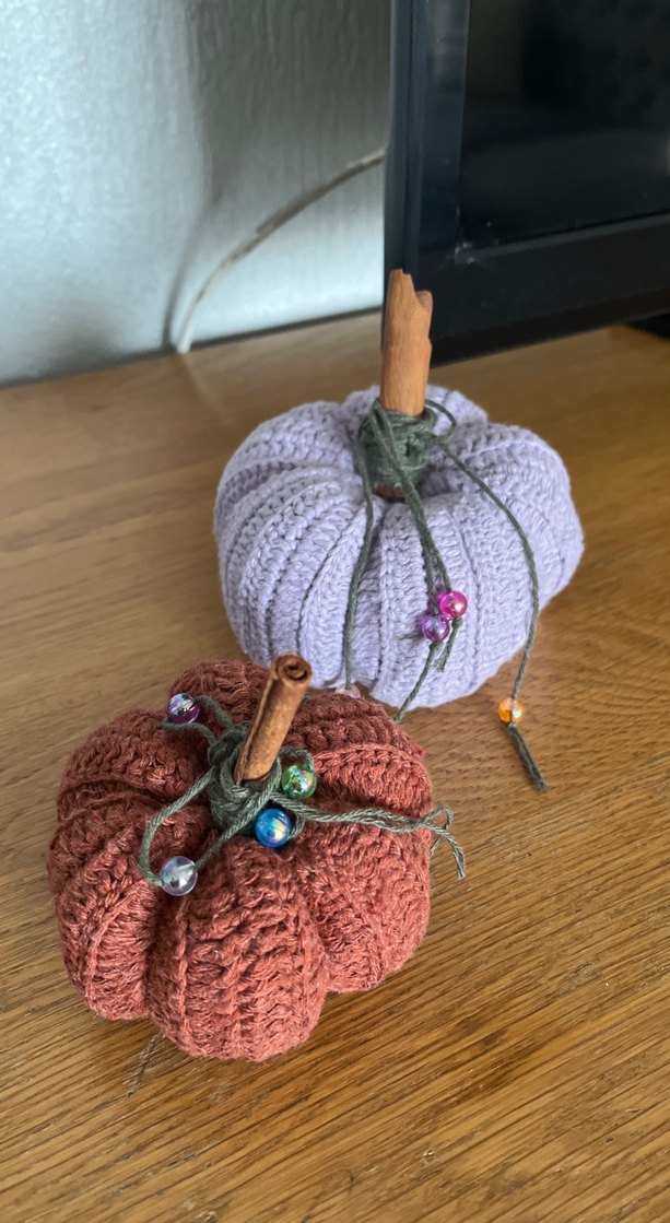 Mor ve kahverengi renkte, küçük boncuklar ve tarçın çubuğu saplı el örgüsü dekoratif balkabakları seti. Sonbahar dekorasyonu için uygun.