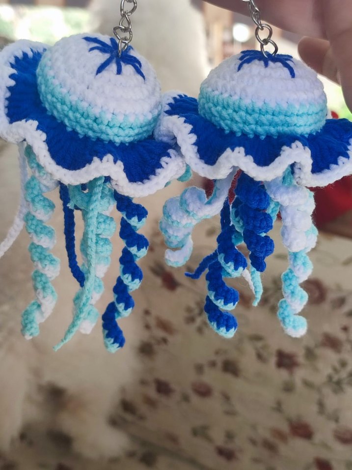 Adet fiyatıdır. Mavi ve beyaz tonlarda, kıvırcık dokuna sahip el örgüsü denizanası anahtarlıklar. Annem kendi elleriyle örüyor. İsteğe bağlı sipariş oluşturmak ve daha fazla çeşite ulaşmak için instagram:: @zyntokaa
