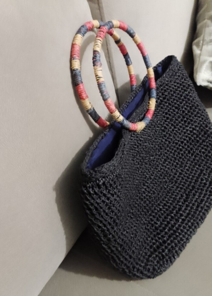 Kağıt ipten deri tabanlı çıtçıt kapamalı içi astarlı antrasit el örgüsü çanta 34 × 22 cm boyutunda