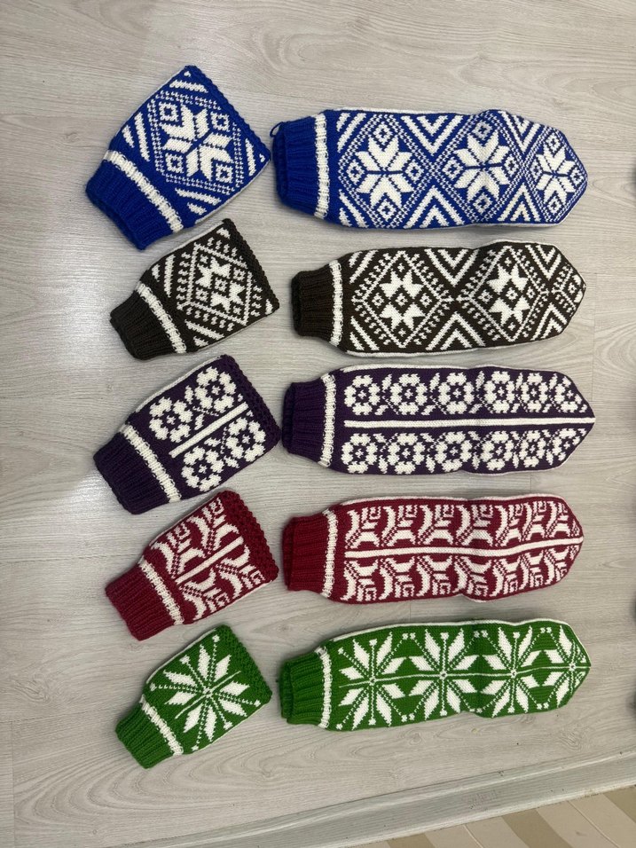 Farklı renklerde, geleneksel desenli el örgüsü eldiven ve patik seti. Soğuk havalar için yumuşak ve sıcak tutar.