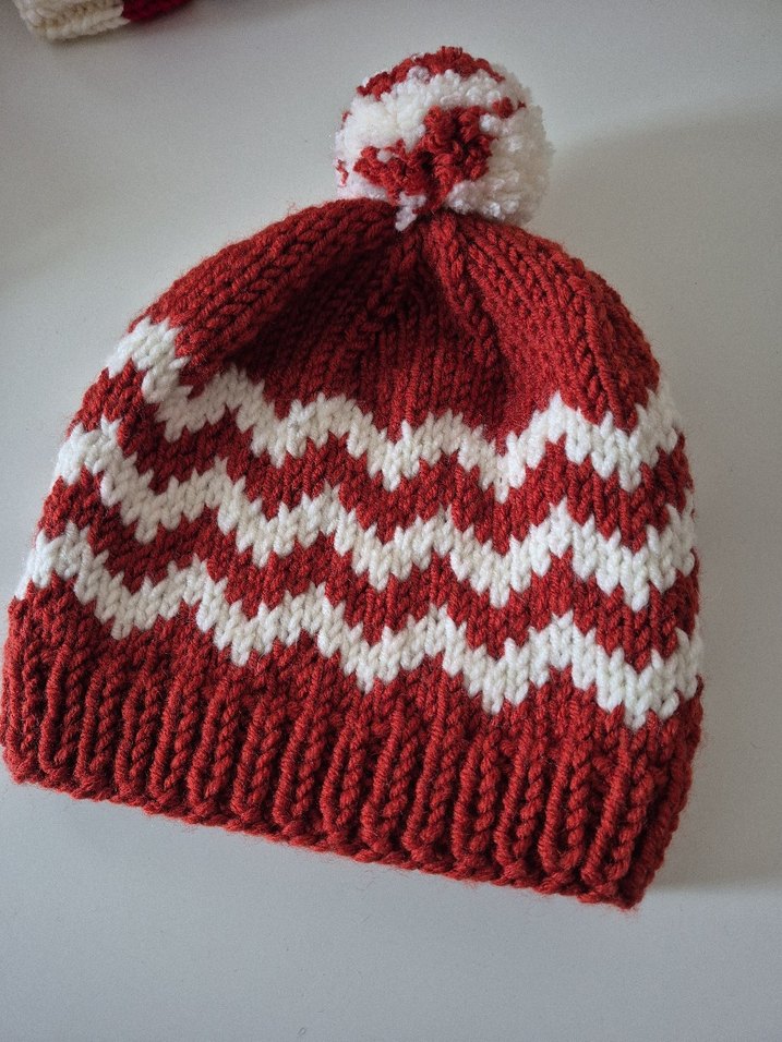 Kiremit ve beyaz zikzak desenli, örgü bere. Üstünde ponpon bulunur, sıcak ve renkli bir aksesuar sunar. 7-8-9 yaş için uygundur