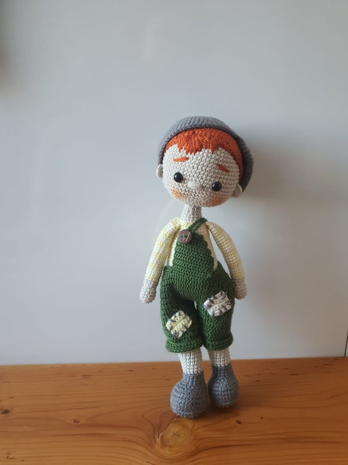 Gri ayakkabılı, haki tulumlu ve gri şapkalı, turuncu saçlı el örgüsü erkek bebek oyuncak. amigurumi örgü bebek. hazır ürün hemen kargo. 31 cm. #bebek #oyuncak #amigurumi #amigurumibebek #örgübebek