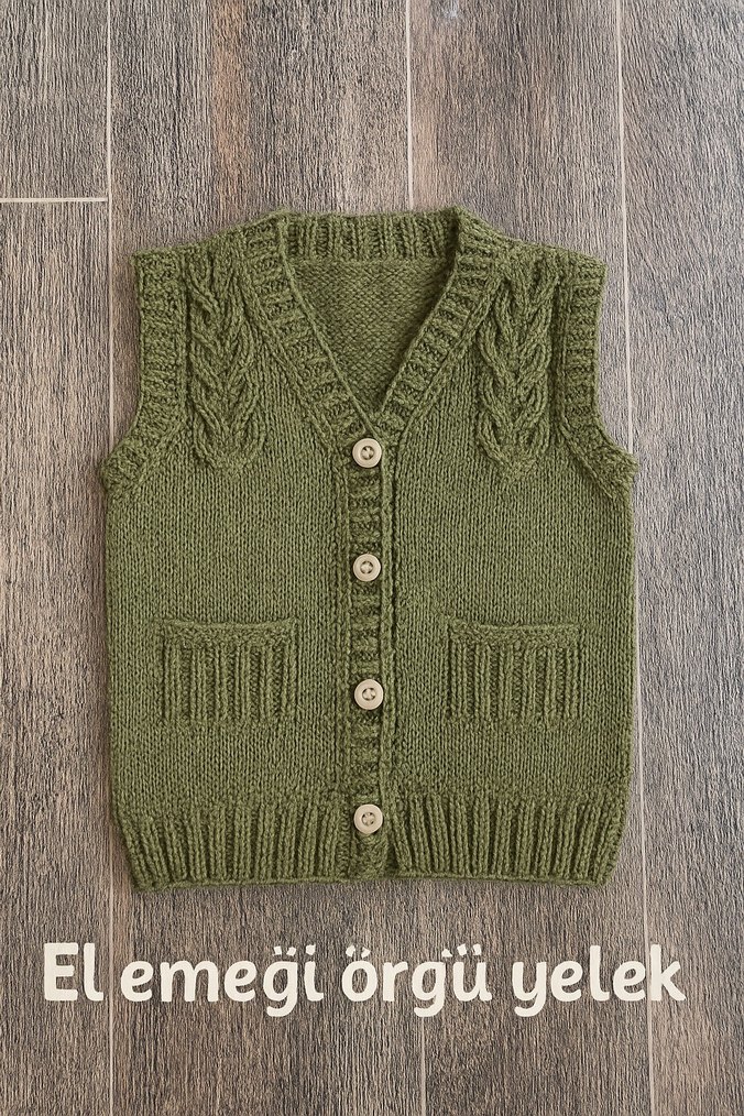 Khaki renkte, el emeği örme kolsuz, düğmeli ve iki cepli regular fit hırka. Yumuşak örme kumaştan yapılmıştır.
