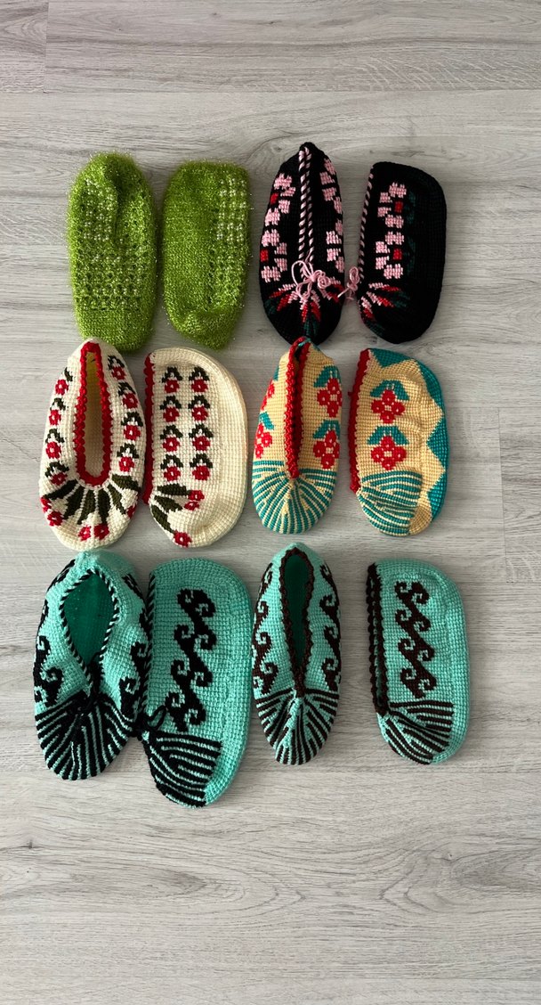 Yumuşak iplikle el örgüsü yapılmış, çeşitli renk ve çiçek desenlerine sahip geleneksel patikler. Hepsini birlikte göndereceğim. 6 Adet 3 çift 40 numara 3 çift de 37/38 numaradır.