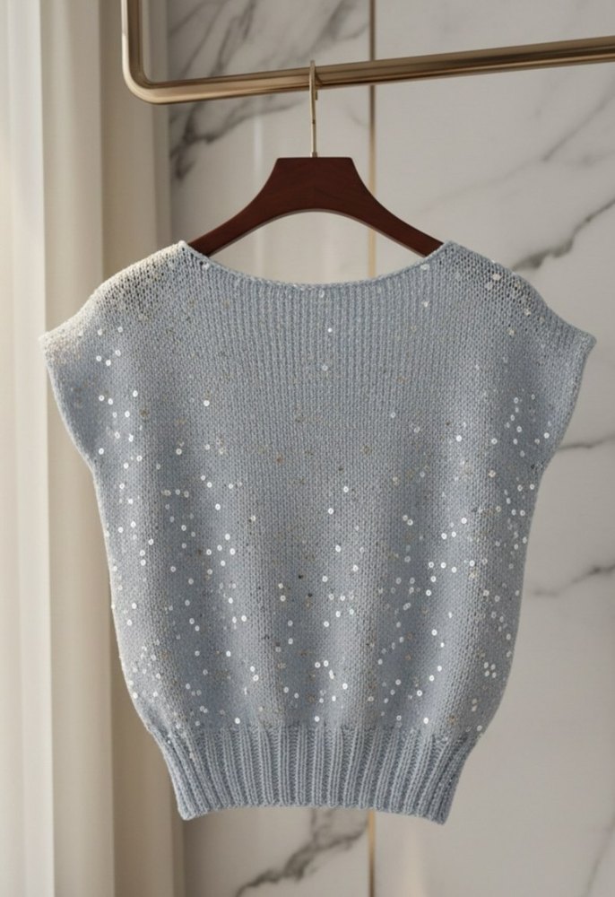 Gri renkte, el örgüsü pul detaylara sahip kolsuz triko süveter. Yuvarlak yaka ve kısa kesimli, rahat ve modern bir görünüm sunar. S-M beden için uygundur.