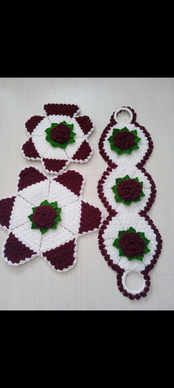 El örgüsü beyaz ve bordo gül desenli, yeşil yaprak detaylı mutfak seti, tutacaklar ve dekoratif asma parça içerir.