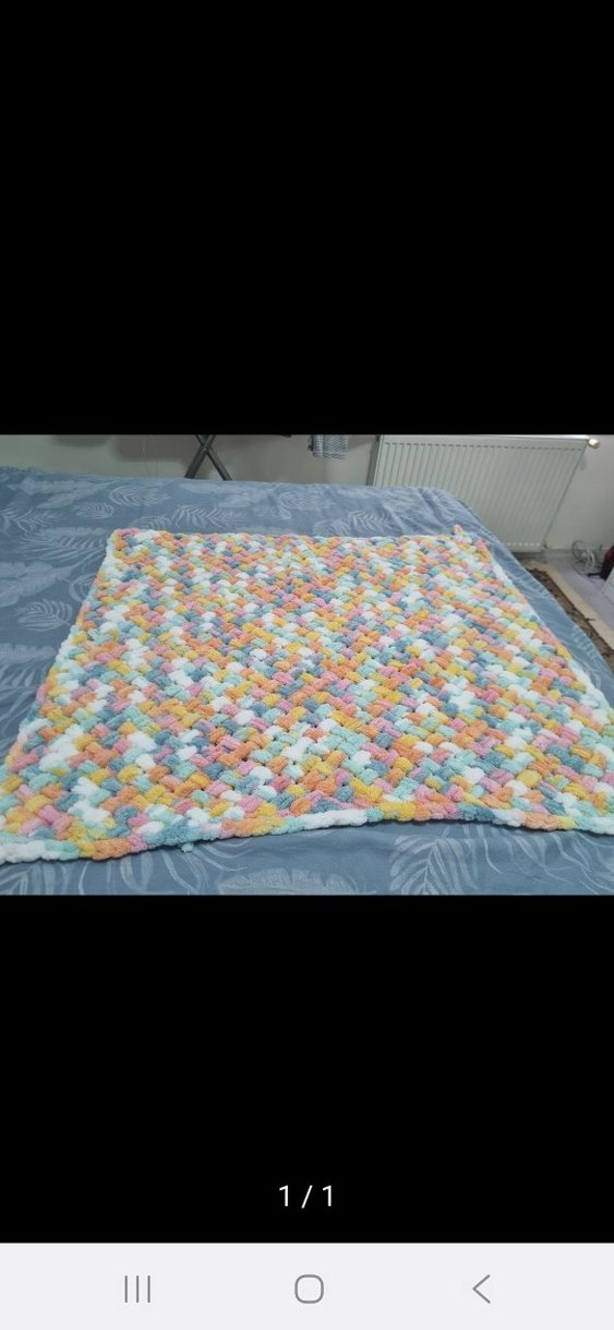 Çocuklar için yumuşak örgü battaniye, pastel çok renkli tie-dye desenli. Rahat ve renkli kullanım için uygundur.