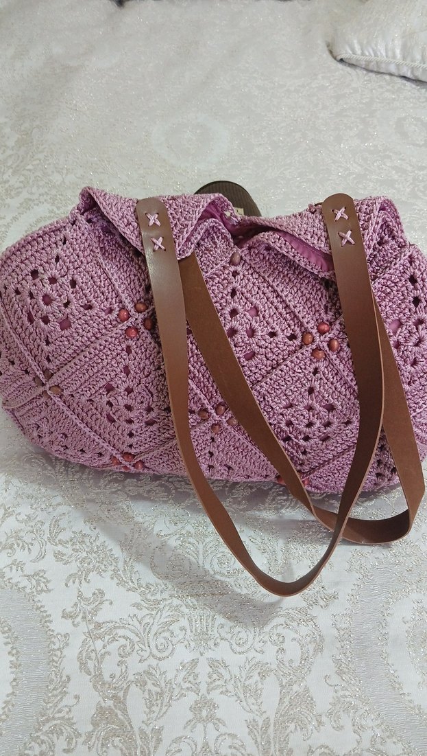 Pembe renkli, dantel detaylı örgü kadın çanta, yumuşak deri saplarla bohem ve rahat bir tarz sunar.