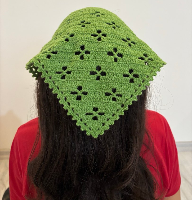 Yeşil renkli, dantel detaylı örgü kadın bandana, bohem ve retro tarzıyla rahat bir görünüm sunar.