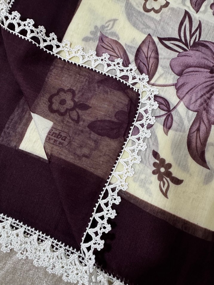 Bohem tarzda, koyu renkli çiçek desenli tekstil kumaştan yapılmış, beyaz dantelli kenar detayına sahip kadın fular.