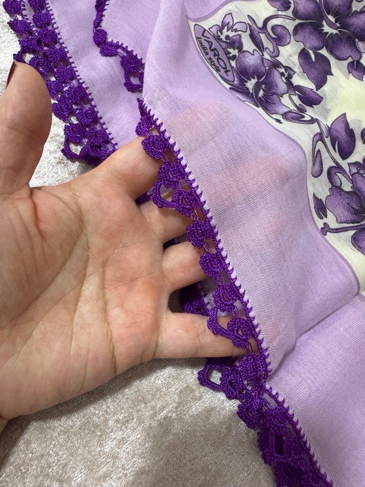Mor renkli, dantel detaylı tekstil kumaştan yapılmış, bohem ve retro tarzda kadın fuları.