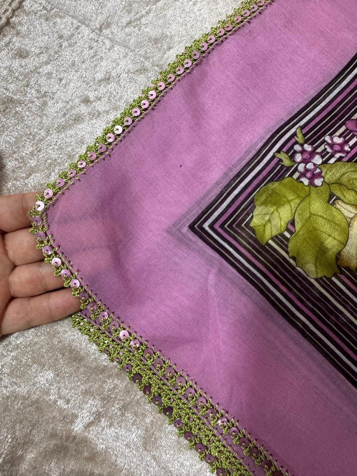 Mor renkli, parlak dantel kenarlı ve çiçek desenli kadın fuları. Bohem tarzını yansıtan yumuşak dokulu tekstil kumaş.