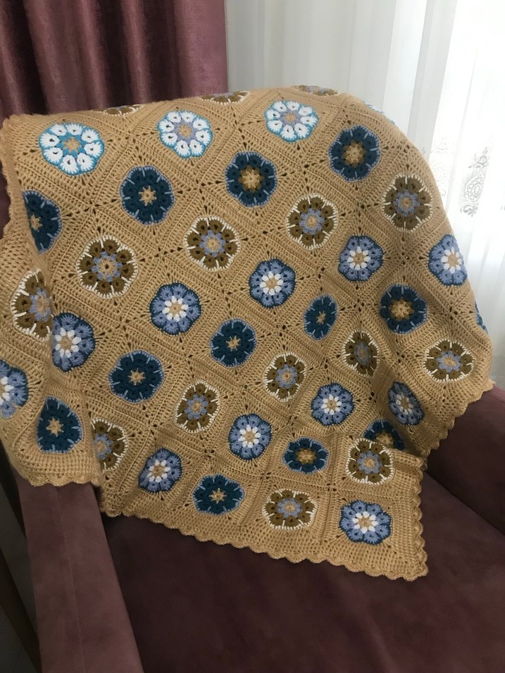 Mavi ve beyaz nakışlı çiçek desenleriyle koyu kahverengi, dokulu ve sıcak bir battaniye.