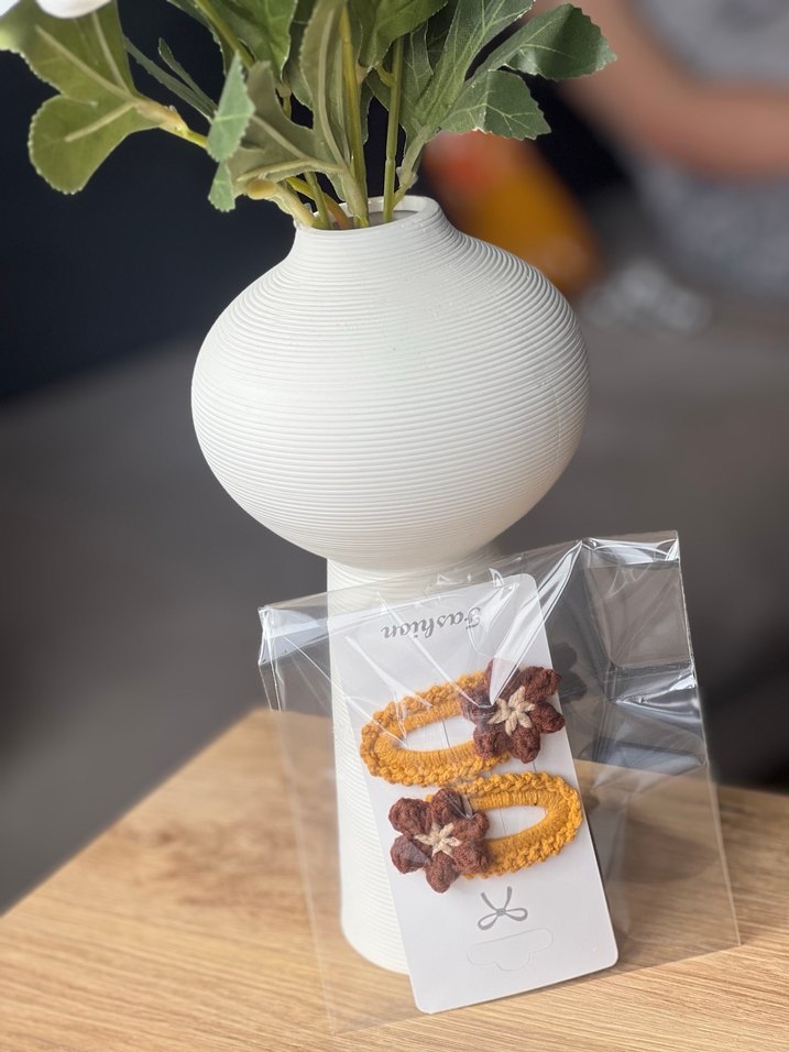 Pastel renkli, örgü yapıda, kahverengi çiçek desenli iki adet bohem tarzı çocuk saç tokası seti.