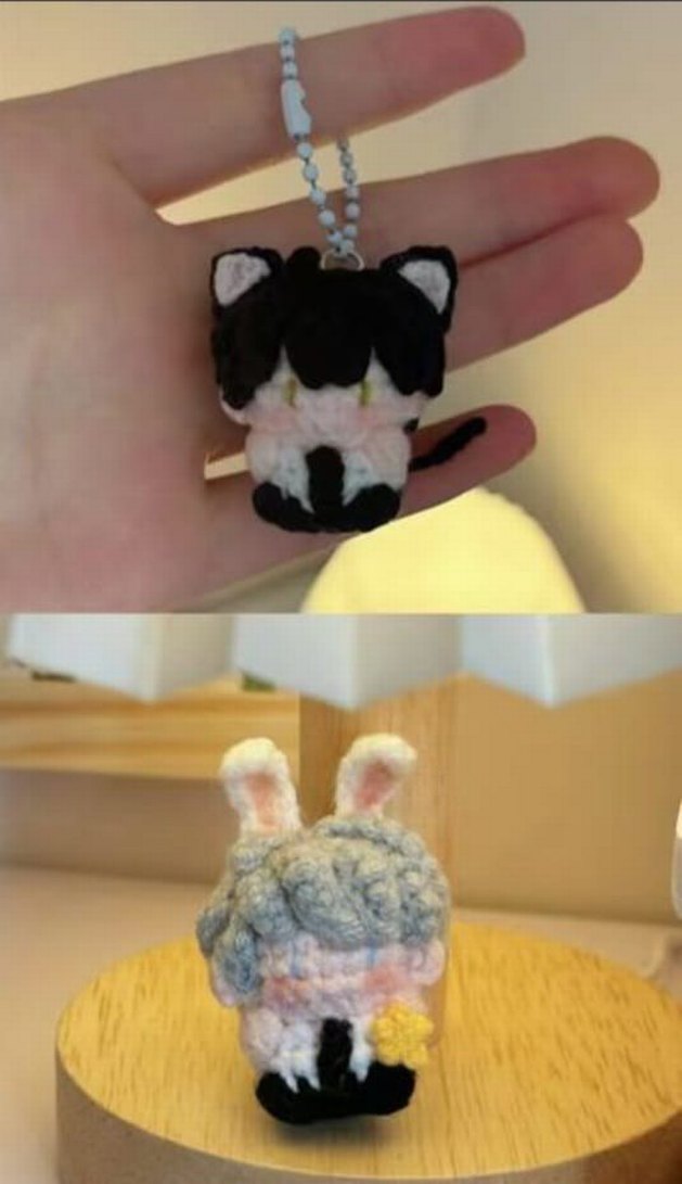 El örgüsü, pastel renklerde gri kedi ve tavşan figürlü anahtarlıklar, küçük ve hafif yapıda.