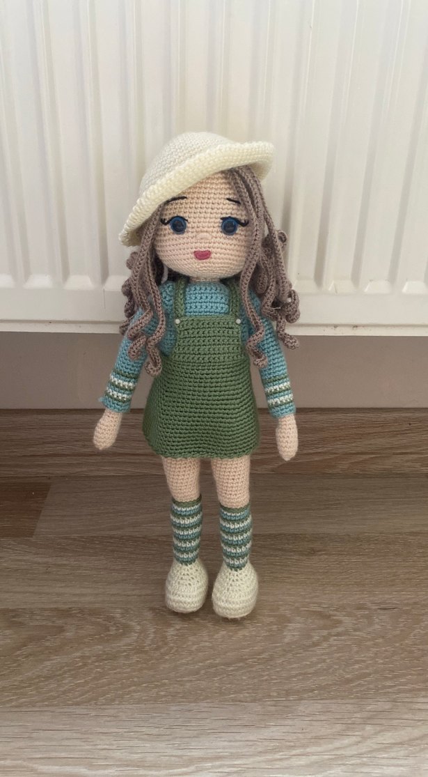 Khaki elbise, gri çizgili çoraplar ve beyaz şapkalı el örgüsü bebek. Yumuşak tığ işi doku ve detaylı yüz ifadeleri.