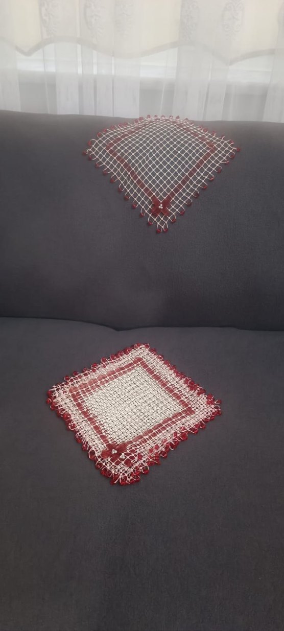 Kırmızı ve beyaz renklerde, el örgüsü geleneksel desenli dekoratif örtüler. İnce dokuma ve küçük çiçek detaylarıyla klasik bir görünüm sağlar.