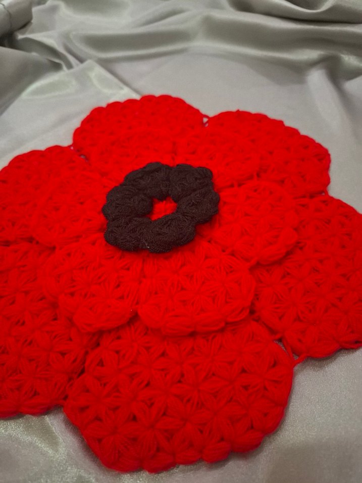 El örgüsü kırmızı çiçek şeklinde, koyu renkli merkeziyle dokulu desenli lif modeli.