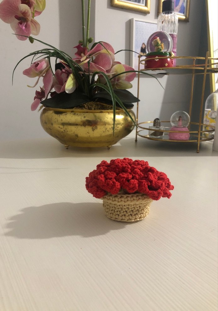 El yapımı bohem tarzda, küçük örme sepette kırmızı tığ işi çiçekler. Her mekana sıcak ve sanatsal bir dokunuş katıyor.