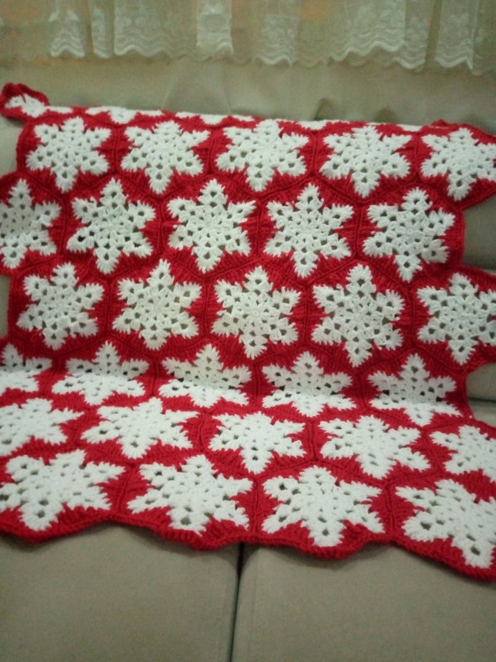 El örgüsü beyaz çiçek desenleriyle kırmızı renkte, yumuşak ve rahat dokulu örgü çocuk battaniyesi.