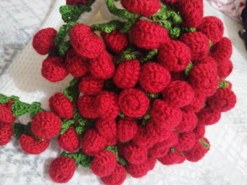Yumuşak iplikle el örgüsü bohem tarzda kırmızı gül süslemeleri. El işi ve dekorunuza doğal bir dokunuş katar.