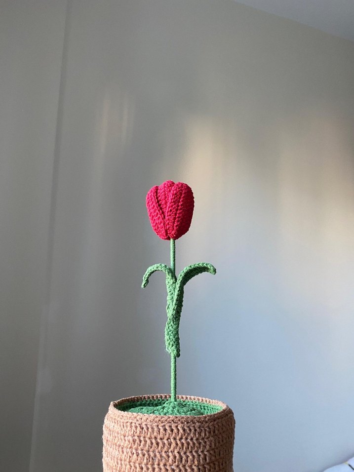 Bej saksıda yeşil yapraklı el örgüsü kırmızı lale süs çiçeği. Basit ve şık dekoratif bir parça.