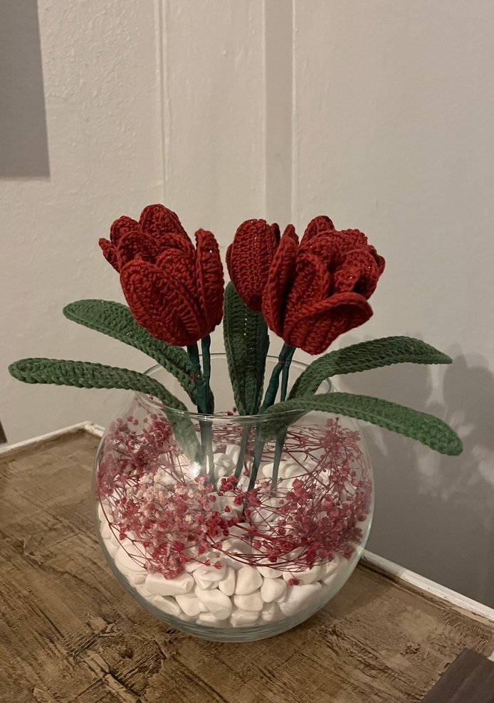 El Örgüsü Kırmızı Laleler ve Cam Vazoda