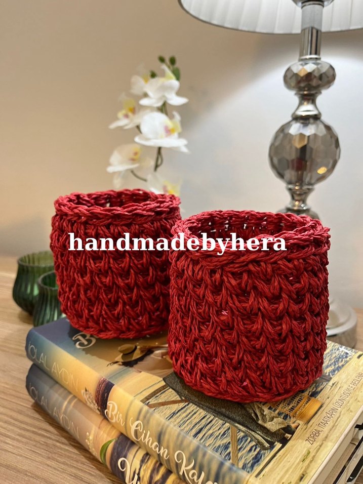 İki adet el örgüsü, dokulu kırmızı sepetten oluşan set. Her sepet özenle hazırlanmış ve 'handmadebyhera' etiketi taşımaktadır. Çap 10 cm yükseklik 8 cm uzunluğunda dır iki kat kağıt ip ile örülmüştür