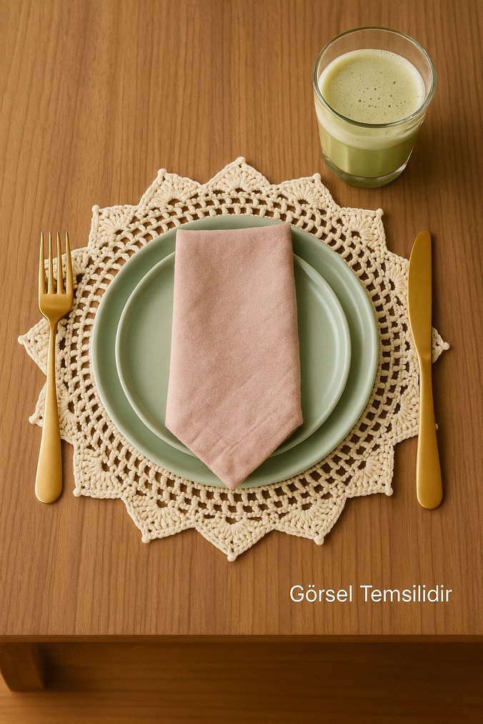 Evinize doğal, sıcak ve zarif bir dokunuş… Tamamen el yapımı, %100 organik koton ipten örülmüş yuvarlak amerikan servis. Fiyatlar tek ürün için geçerlidir. Kişi sayısı için toplu alım notunuzu mutlaka iletin. - 40×40 cm yuvarlak form - %100 organik koton ip - Leke tutmaz, hijyenik - Tüy/kıl bırakmaz – yumuşak ve dayanıklı - Formunu koruyan kaliteli örgü - 1 haftalık el emeği ve özel işçilik - Boho, vintage, modern ve soft minimal dekorlara uyumlu Kullanım alanları: Sofra sunumu, çeyiz hazırlığı, özel davet, kahve köşesi, dekoratif örtü, brunch styling Bakım: Ilık suda nazik elde yıkama önerilir. El emeği & doğal yaşam sevenler için zamansız bir parça. Minimal, boho ve cozy sofra sevenler için