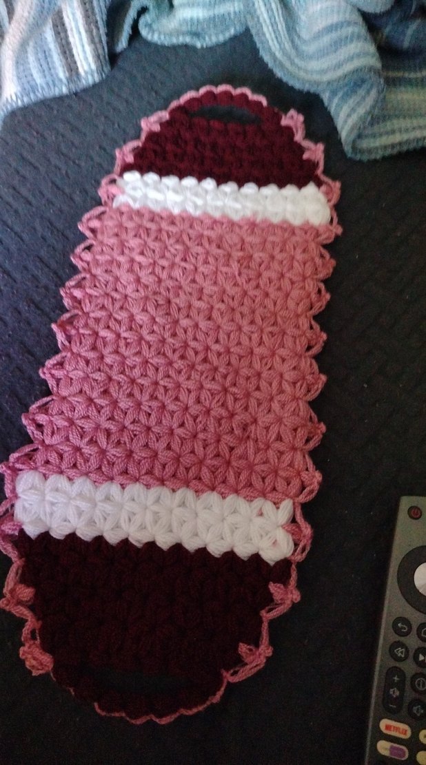 Koyu pembe, beyaz ve bordo detaylı el örgüsü banyo süngeri, dokulu desene ve tutma sapına sahiptir.