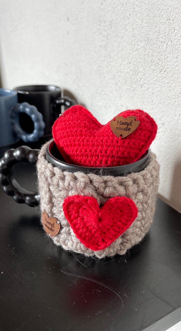 Bohem tarzı el yapımı kupa kılıfı, kırmızı kalp süslemeli ve içinde küçük yumuşak kalp bulunur, sıcaklık ve şıklık katar. ❤️